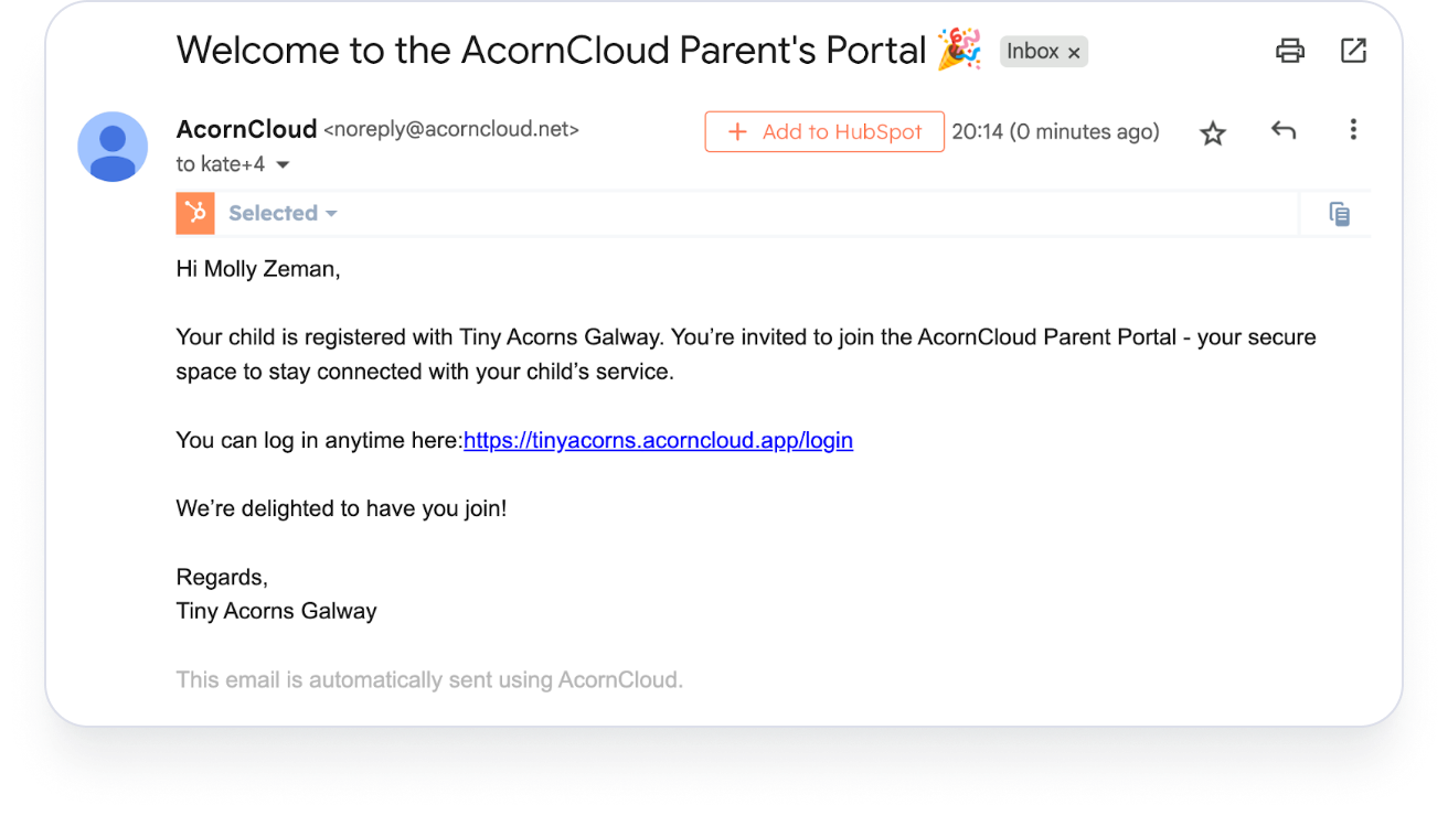 Look for the email “Welcome to the AcornCloud Parent’s Portal” from noreply@acorncloud.net and click the blue login link.